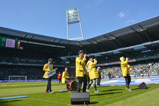 Die Sandkastenfreunde treten vor dem Nordderby gegen den HSV gemeinsam mit Tjalf Hoyer von den Afterburnern auf dem Rasen des Weserstadions auf. Philipp Bargfrede moderiert auf Platt an. „Gröön un Witt“ ist seitdem fester Bestandteil jedes Bremer Heimspiels.